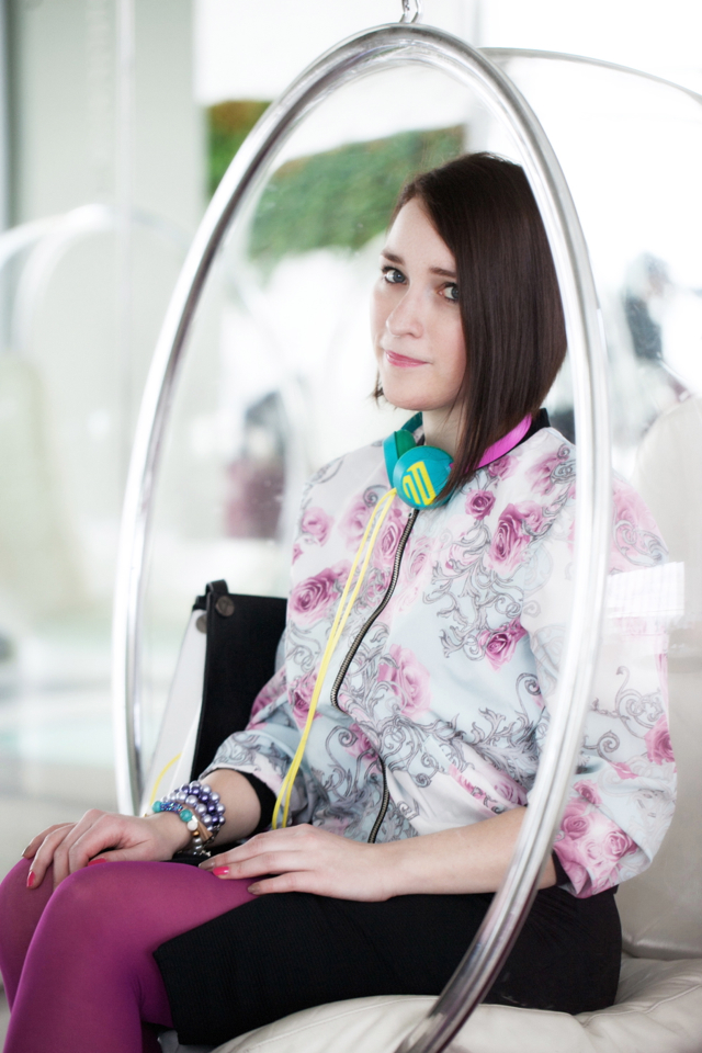 bomber jacket w pastelowe kwiaty, czarna ołówkowa spódnica, turkusowe szpilki