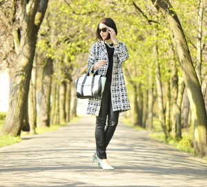 Delikatna mięta w kontraście z czernią. Zestaw dla mnie idealny. I te detale… łańcuszek, zegarek. I kolor torebki – świetny akcent. Poproszę całość :)