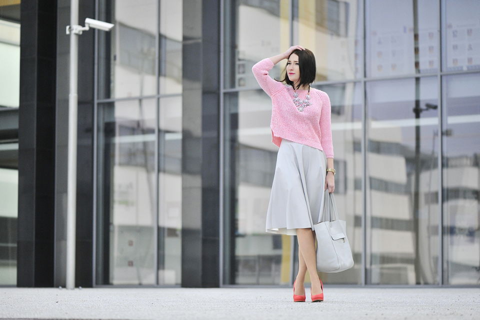 Dzisiaj na blogu stylizacja w pastelowych kolorach. Jest kobieco, delikatnie, romantycznie i elegancko. Łączę tutaj szarą rozkloszowaną spódnicę z ekoskóry z morelowym swetrem. Aby dodać trochę błysku zdecydowałam się na bardzo zdobny naszyjnik również w pastelowych kolorach. Zakładając sweter do spódnicy zawsze staram się wybrać taki o długości mniej więcej do talii. Taka długość nie […]