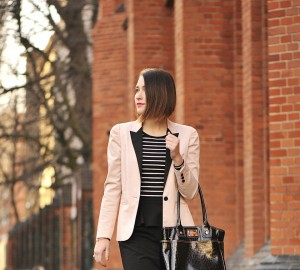 Kraciastą spódniczkę zestawiłam tutaj z białą koszulą. Jeżeli nie macie pomysłu do czego założyć taką wzorzystą spódnicę, to biała lub czarna bluzka to zawsze dobre i sprawdzone rozwiązanie. Jest to bardzo bezpieczne połączenie przez co można zaszaleć z kolorami dodatków, bądź okrycia wierzchniego. Moje szaleństwo objawia się różowym płaszczem. Aby stonować zestaw zdecydowałam się na czarną torebkę oraz botki, no i oczywiście grube rajstopy. Nie lubię rezygnować ze spódnic zimą. Jak Wam się podoba to zestawienie?