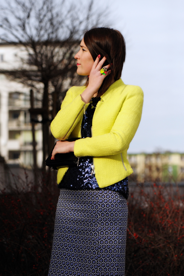 kusząca jest ta spódniczka, jej wzór bardzo przypadł mi do gustu, doskonale wygląda z błyszczącymi czółenkami i żołtą marynarką