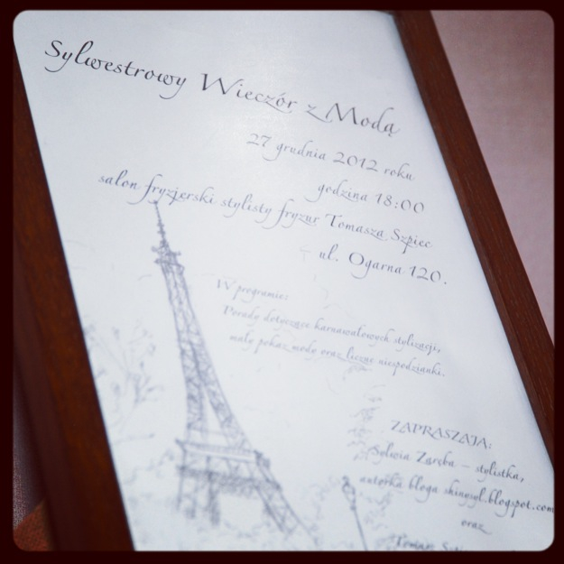 W grudniu wybrałam się do Tomka obciąć włosy. Wtedy właśnie wpadliśmy na pomysł akcji pod kryptonimem „Sylwestrowy wieczór z modą”. Event ten był dla stałych klientek jego salonu. Opowiadałam o tym co założyć na sylwestra, jakie sukienki, dodatki itp. są odpowiednie do różnych typów figury. Pierwszy raz prowadziłam coś takiego i przyznam, że pomimo że się stresowałam, wyszło naprawdę nieźle.